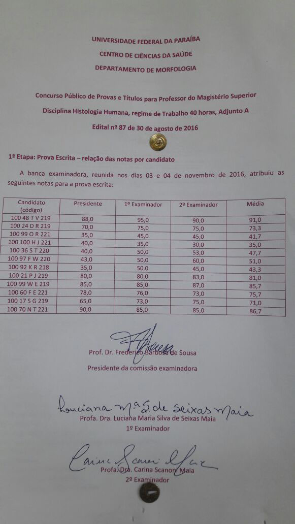 Resultado Prova Escrita do Concurso de Histologia Humana - DEPTO. MORFOLOGIA - CCS - UFPB